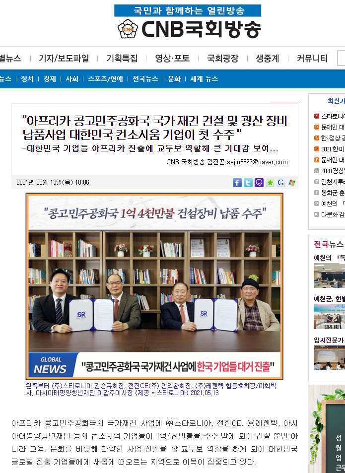 스타로니아 콩고민주공화국 건설장비 납품사업 컨소시움 작성자관리자 등록일 22-06-21 조회865회 본문 2021 뉴스메이커 "대한민국을 이끄는 혁신리더" 선정 인터뷰 피플투데이 4월의 인물 (주)스타로니아 김승규회장 선정 목록